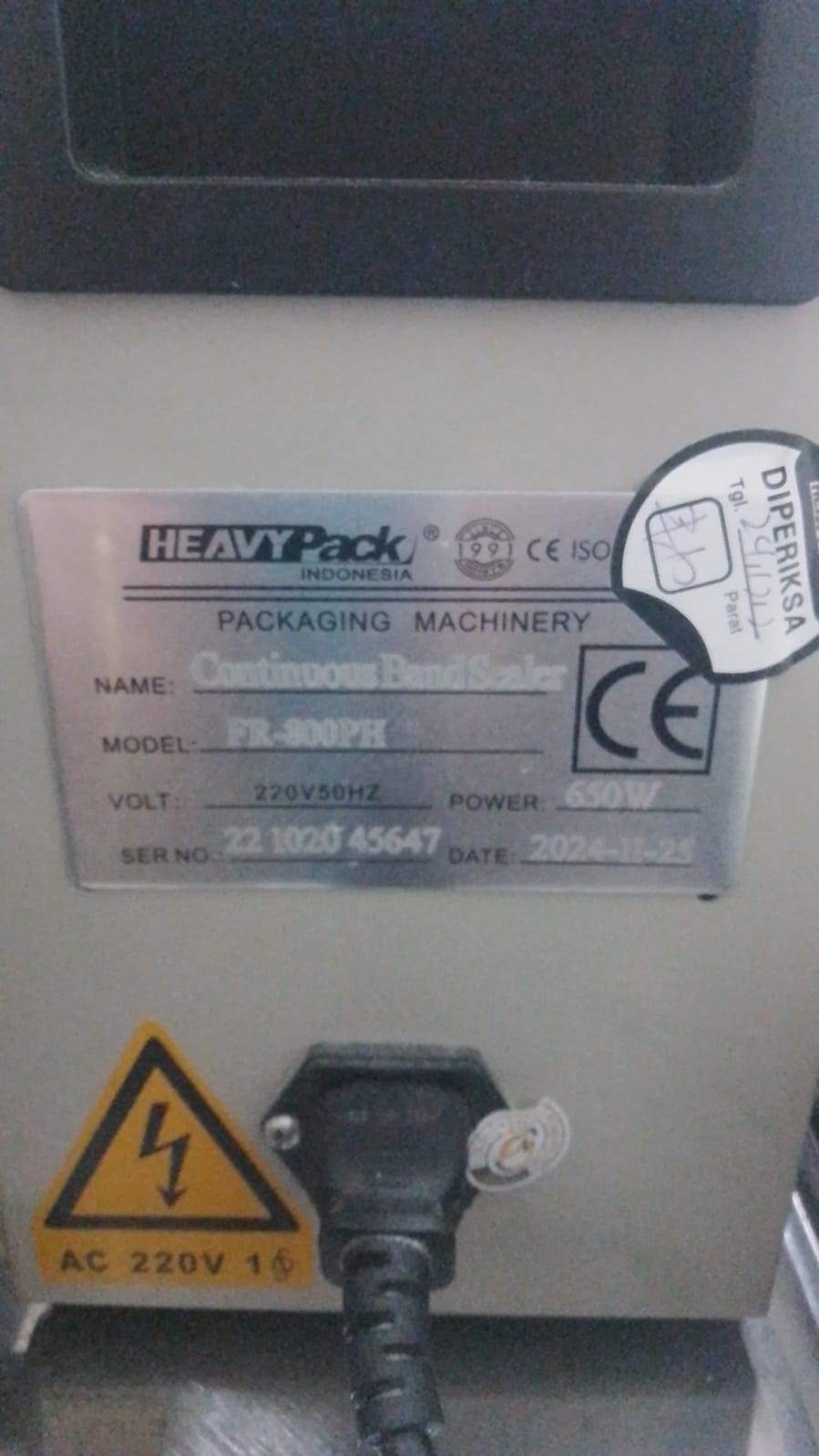 | Spesification | Voltase : 220V / 50-60 Hz Daya Listrik : 500 Watt Kecepatan Seal : 0-12 m / menit Lebar Seal : 0, 6 - 1, 2 cm Temperatur Pemanas Seal : 0-300* C |