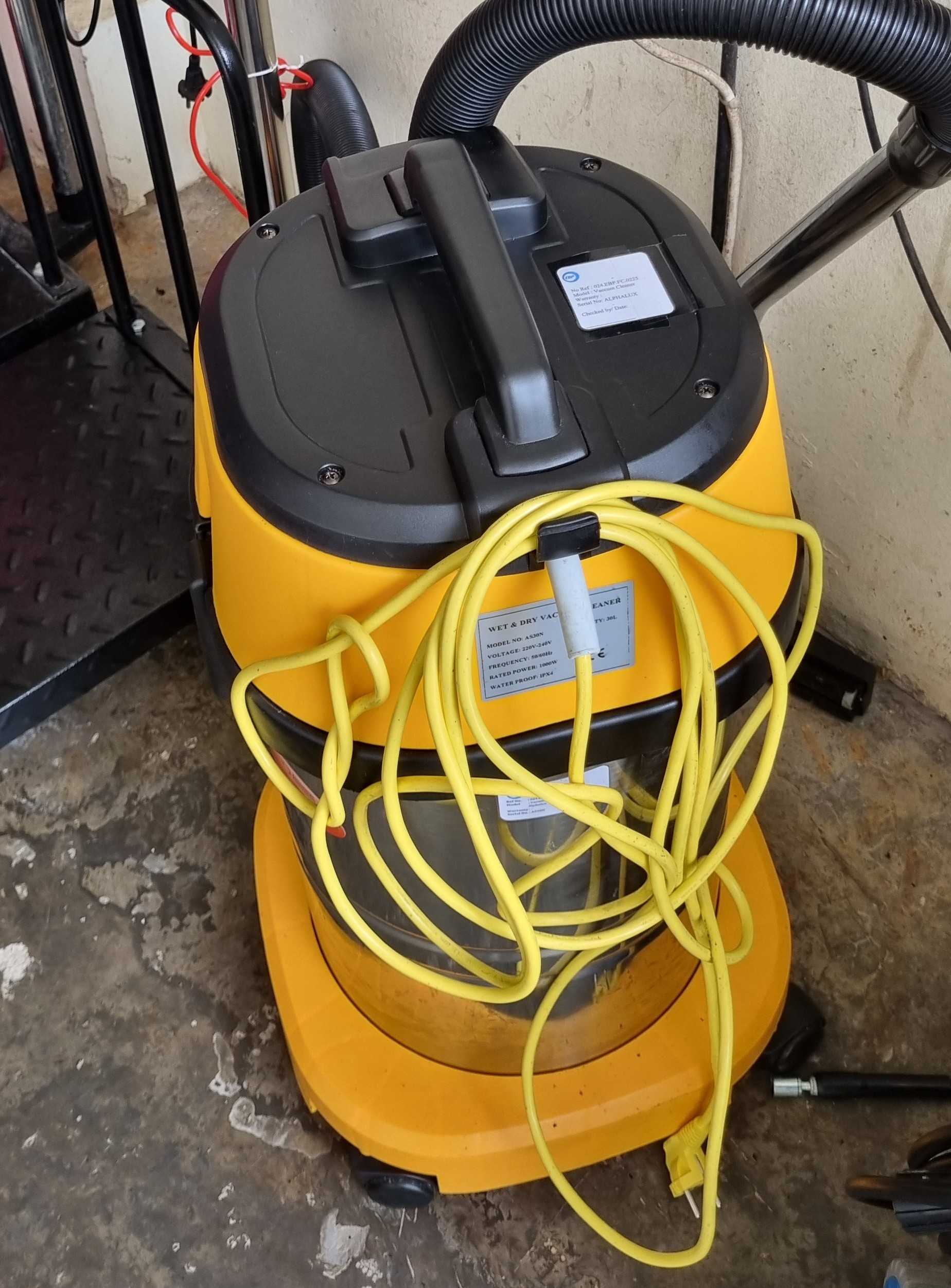 | Spesification | Power : 1000 watt / 230 V - 50/60Hz Tank capacity : 30 ltr stainless tank Vacuum : 2100 mmH2O Airflow : 53 l/s Noise levels : 56 dbA |