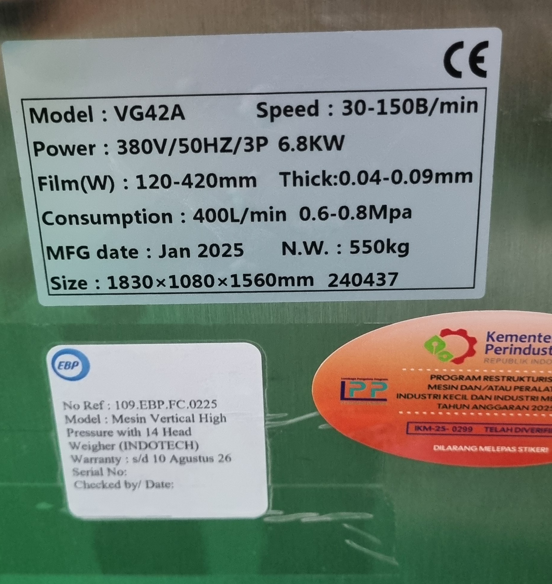 | Spesification | Speed : 30-150 B/min, Power : 6,8 kW, Voltage 380 Volt, 50 Hz, 3 Phase, Film Width : 120-420 mm, Thick : 0,04-0,09 mm, Consumption : 900 L/min, Pressure : 0,6-0,8 Mpa |