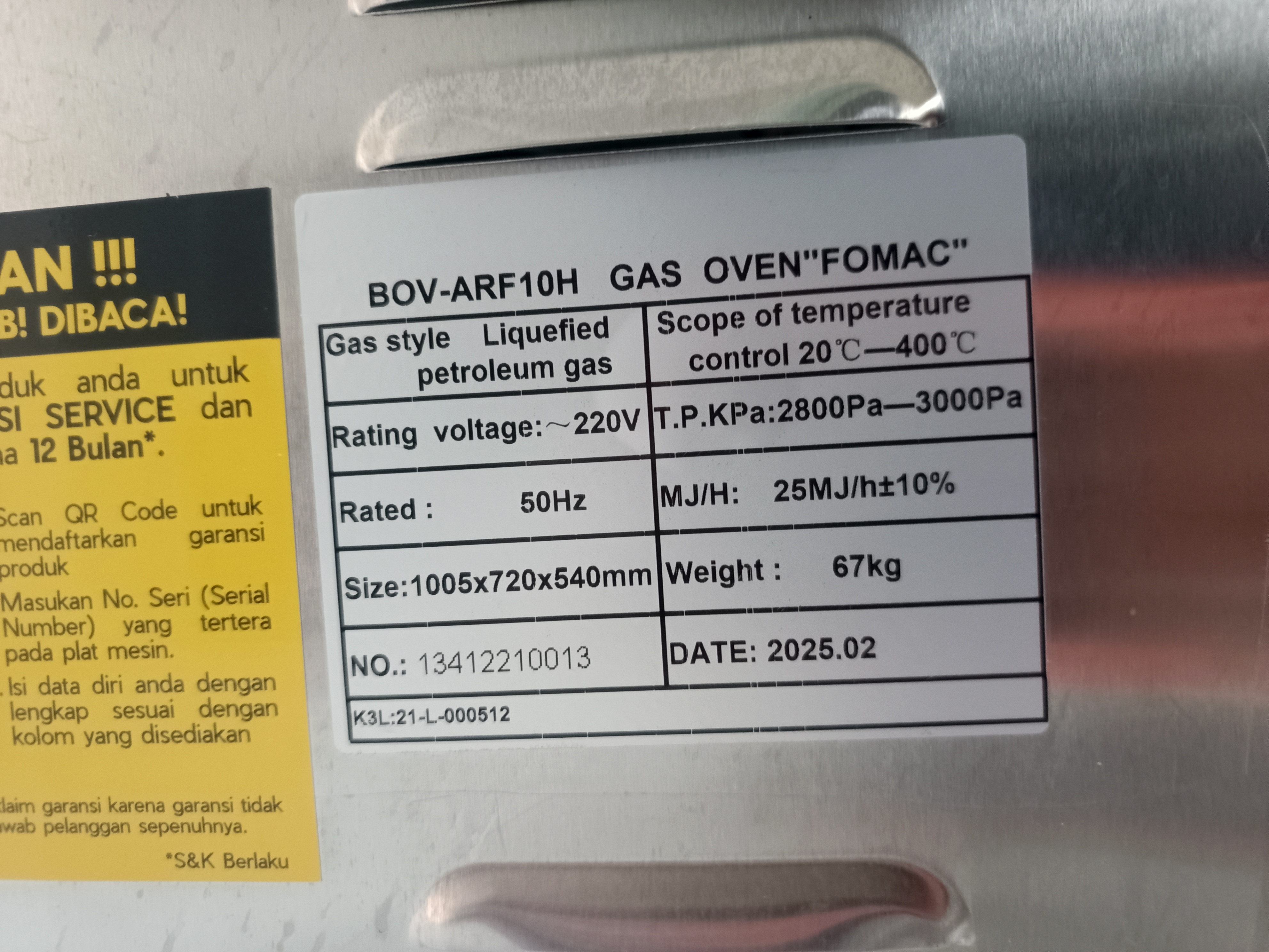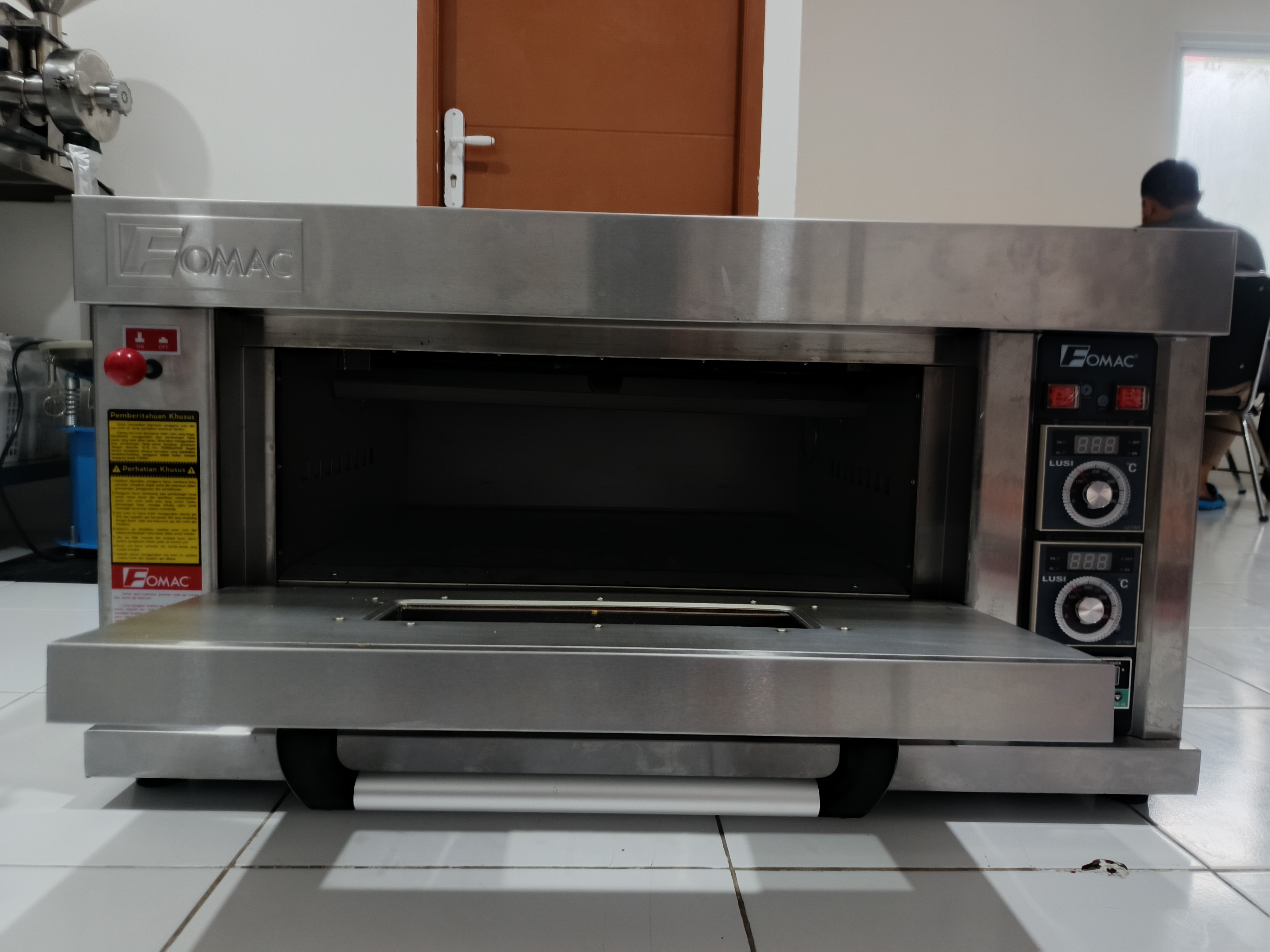 | Spesification | Voltase : 220V / 50-60 Hz Daya Listrik : 75 Watt Kapasitas : 1 Deck 1 Tray Ukuran Tray : 40 x 60 cm Temperatur : 20-400 C |