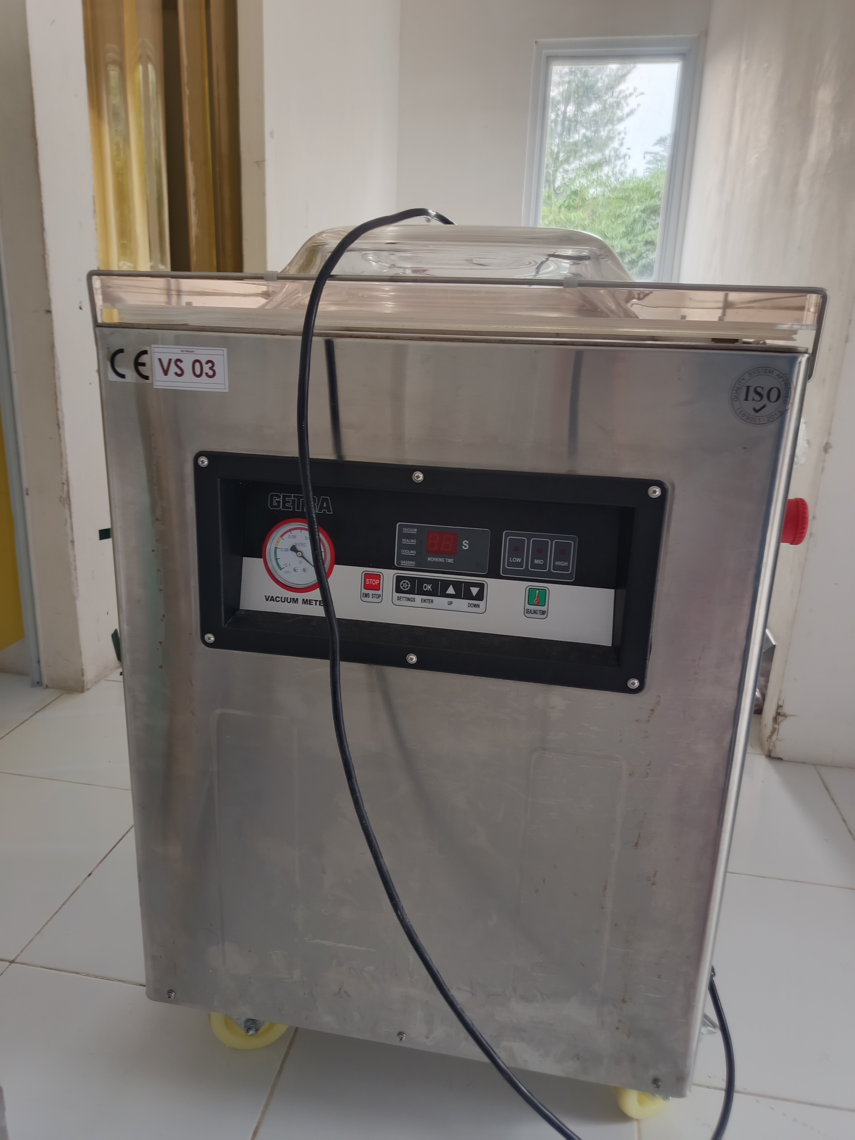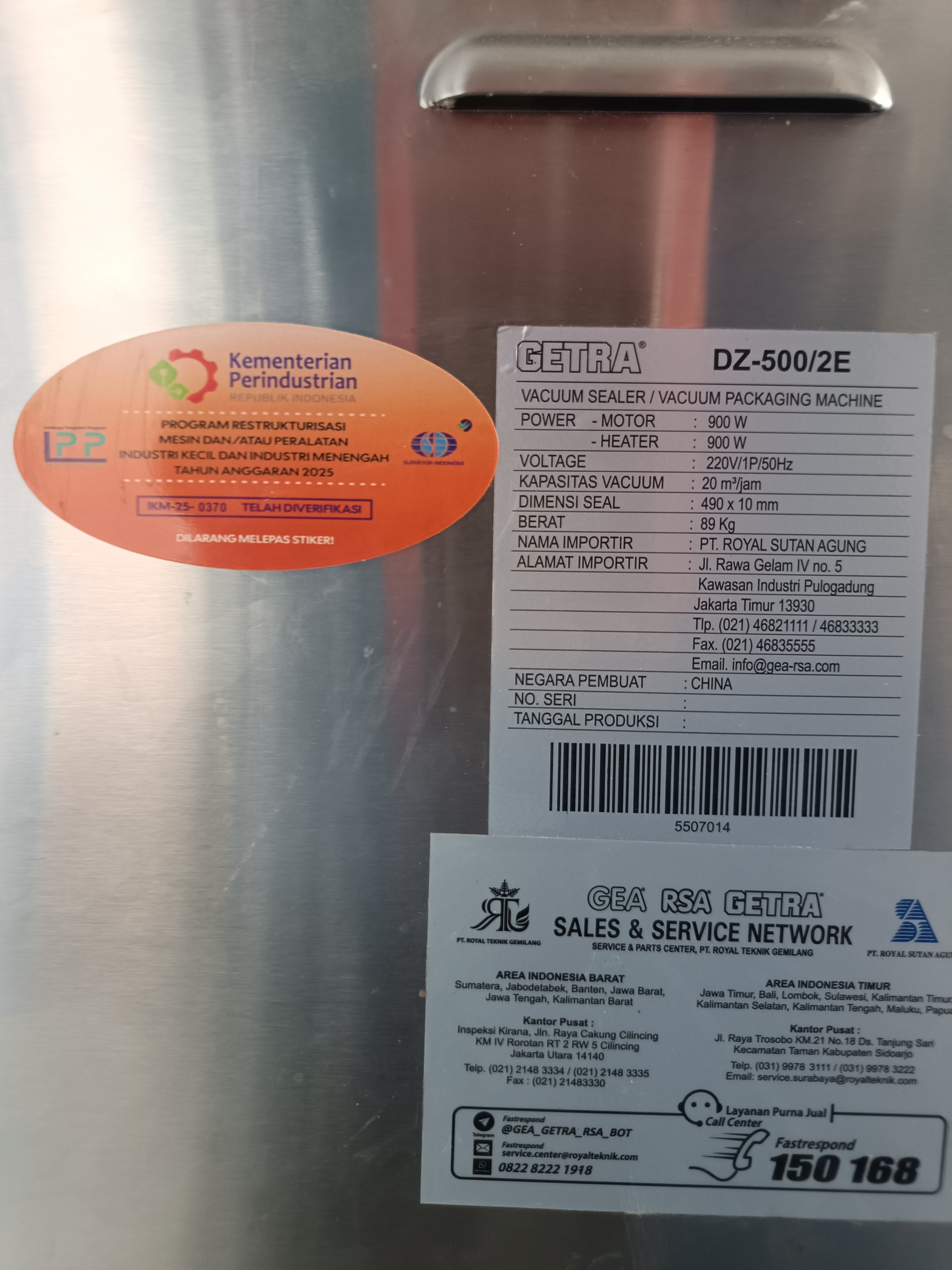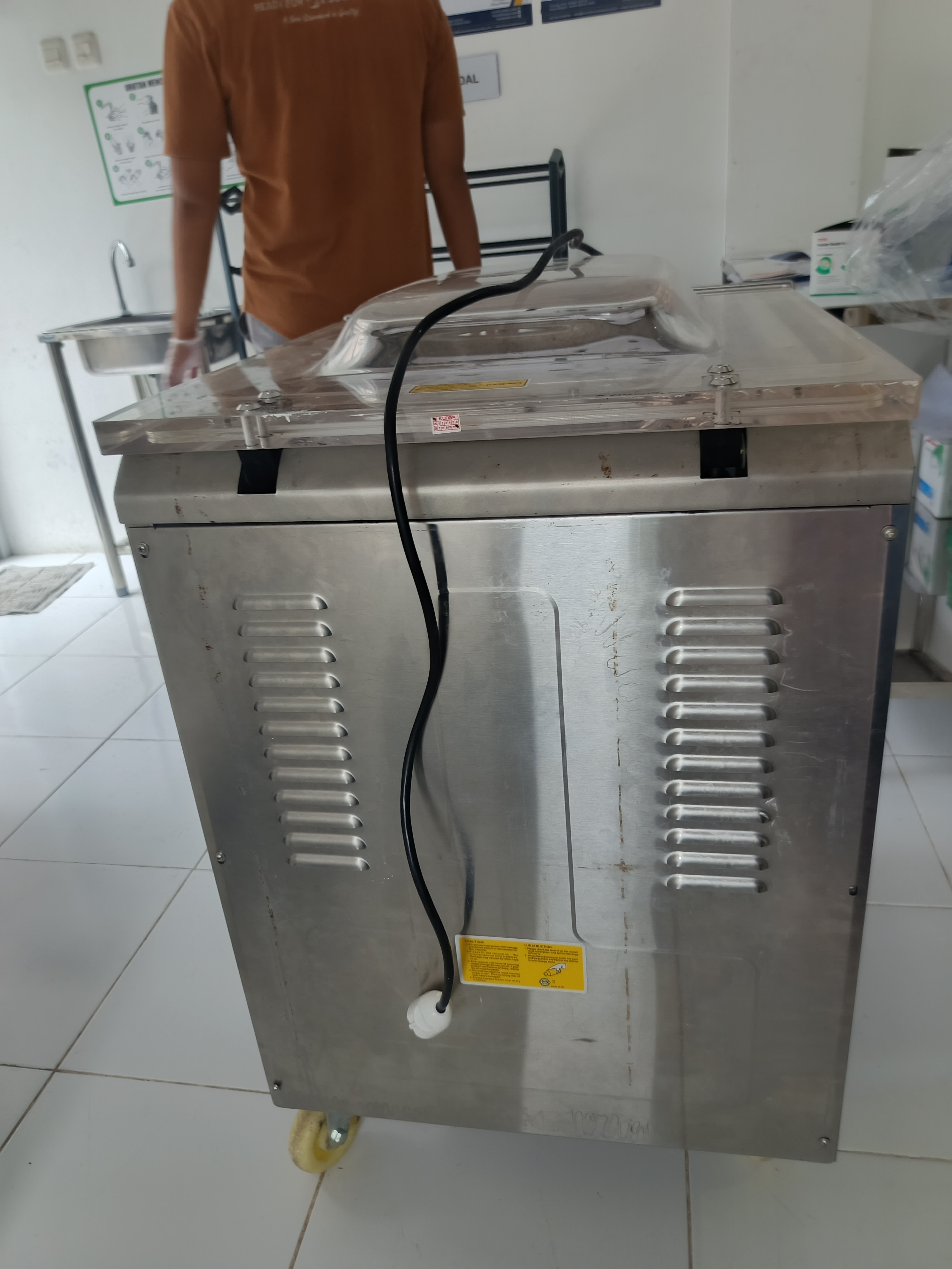| Spesification | Dimensi Packing Mesin : 76 x 69 x 108 cm Dimensi Ruang Vakum : 52 x 52 x 7 cm Lebar Seal : 500 x 8 mm Voltase : 220V Power : 900 Watt Sealing Power : 800 Watt |