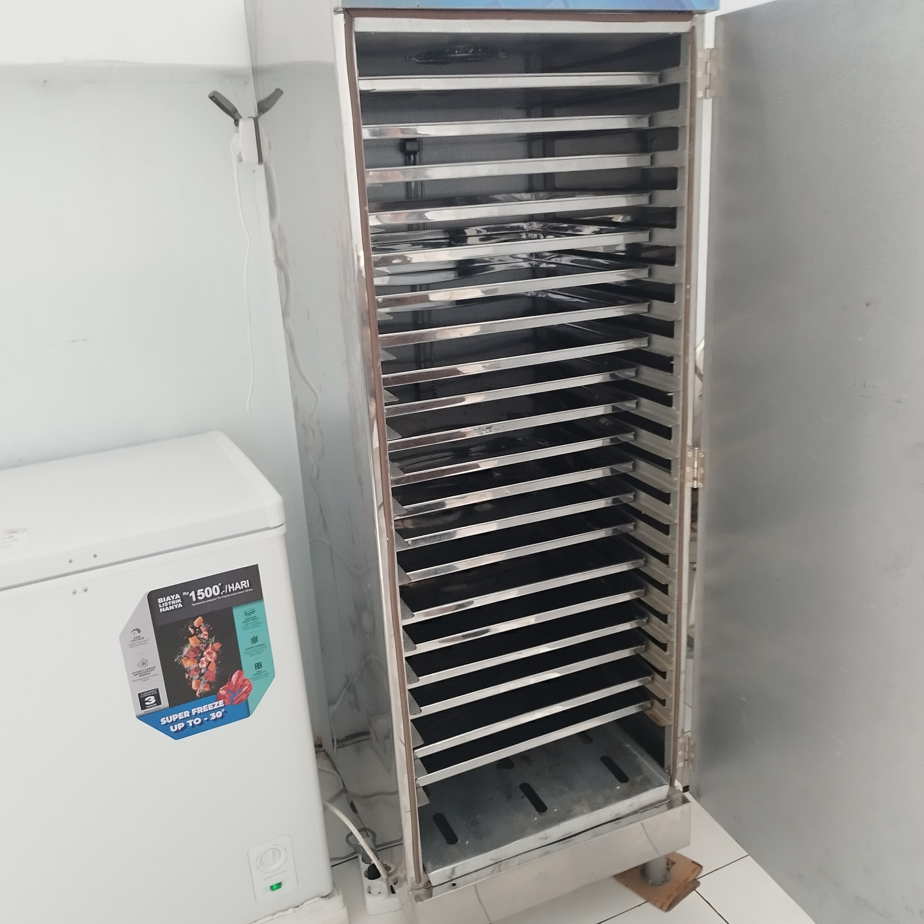 | Spesification | Ukuran : 60*60*180 cm, Kapasitas 100 kg/loyang, Daya Listrik 100 Watt, Burner Gas Otomatis, Material Stainless Steel |