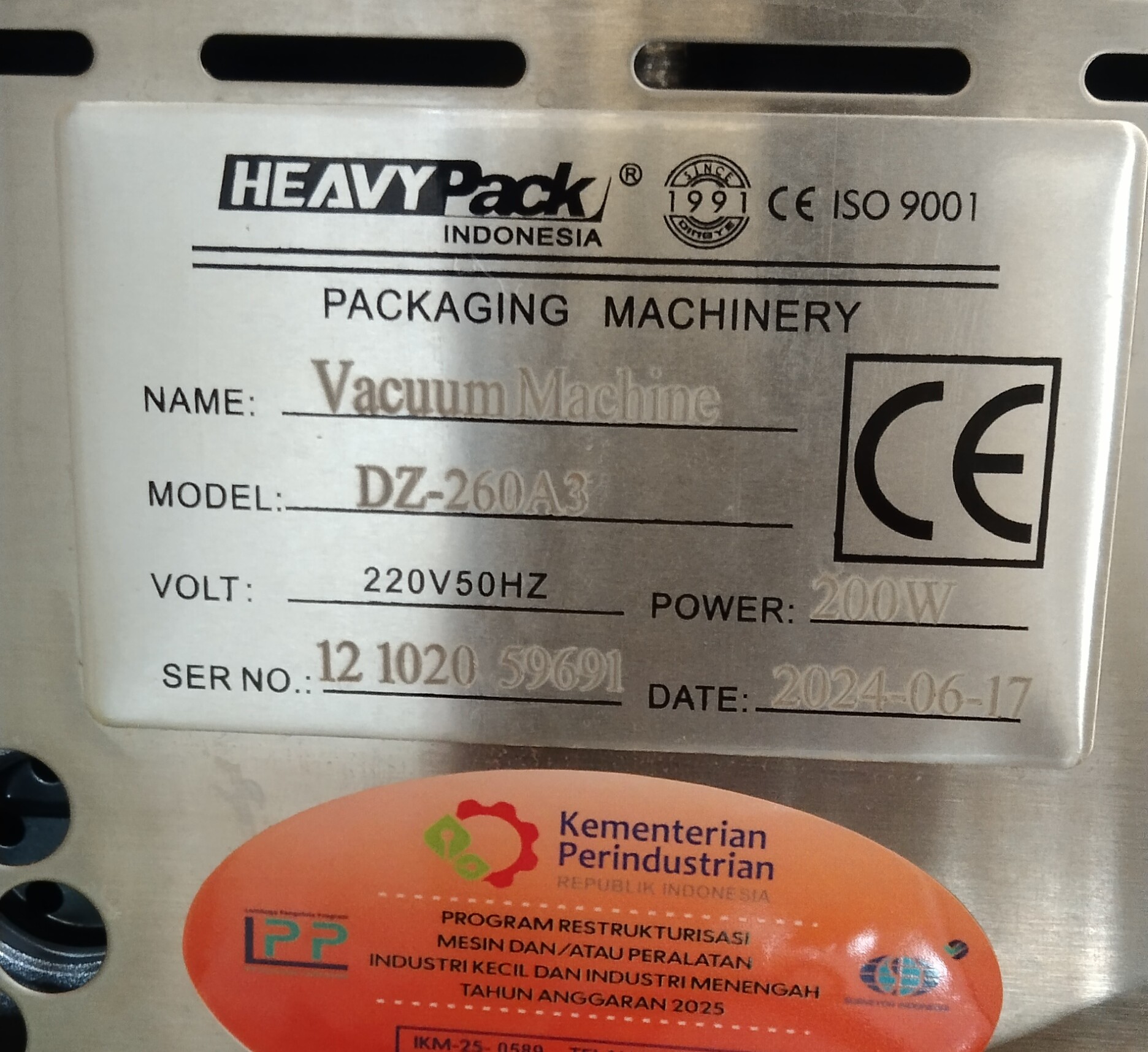 | Spesification | Sumber daya : 220V 50Hz kekuatan : 370W Kekuatan Sealing : 200 W Ukuran Chamber : 380 x 285 x 50 mm Panjang Seal : 260 mm Lebar Seal : 10mm Rating Vacuum : 6.5 m3/h |