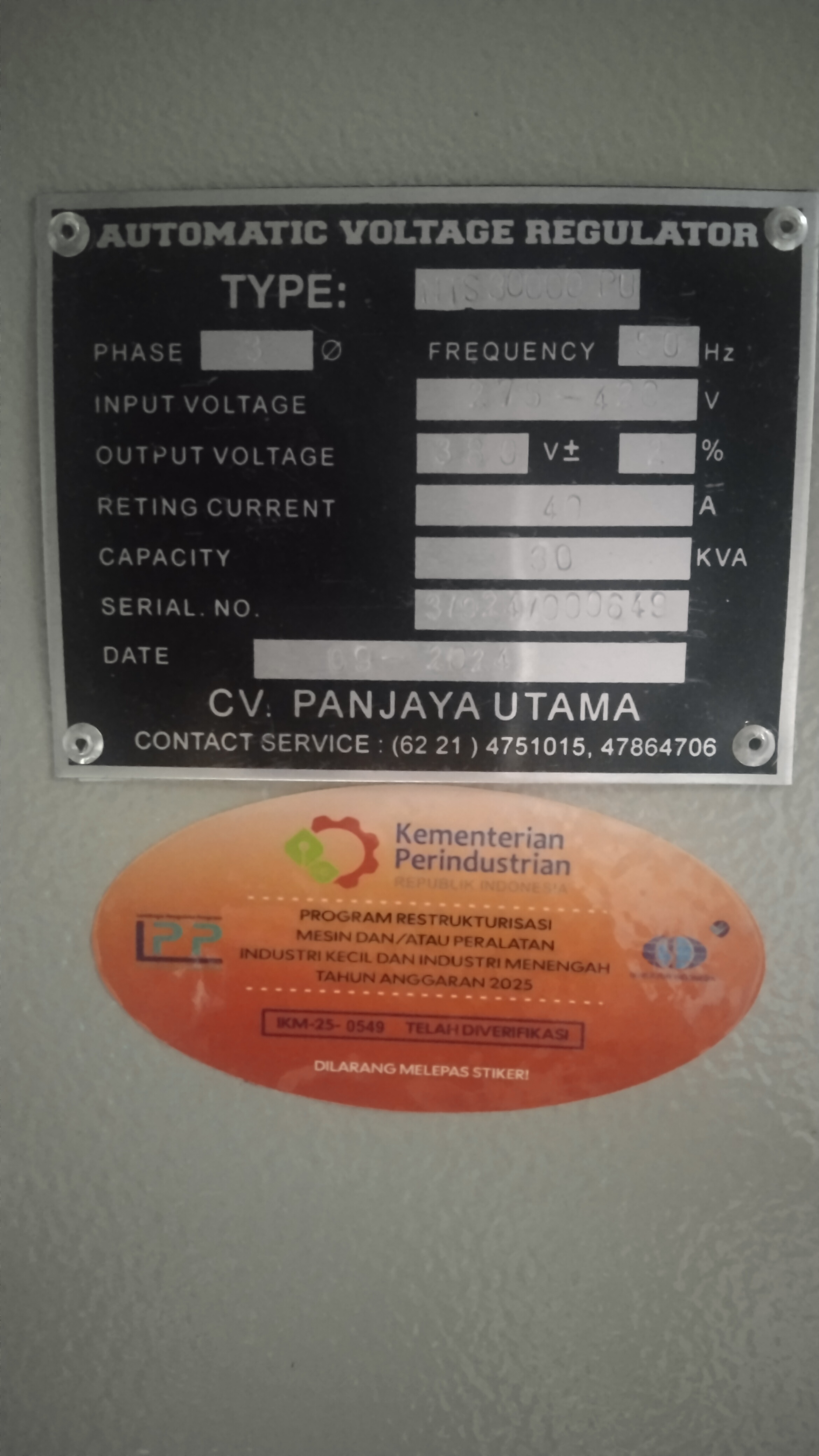 | Item Function | Menstabilkan tegangan listrik 3 phase agar tetap stabil pada level yang aman |