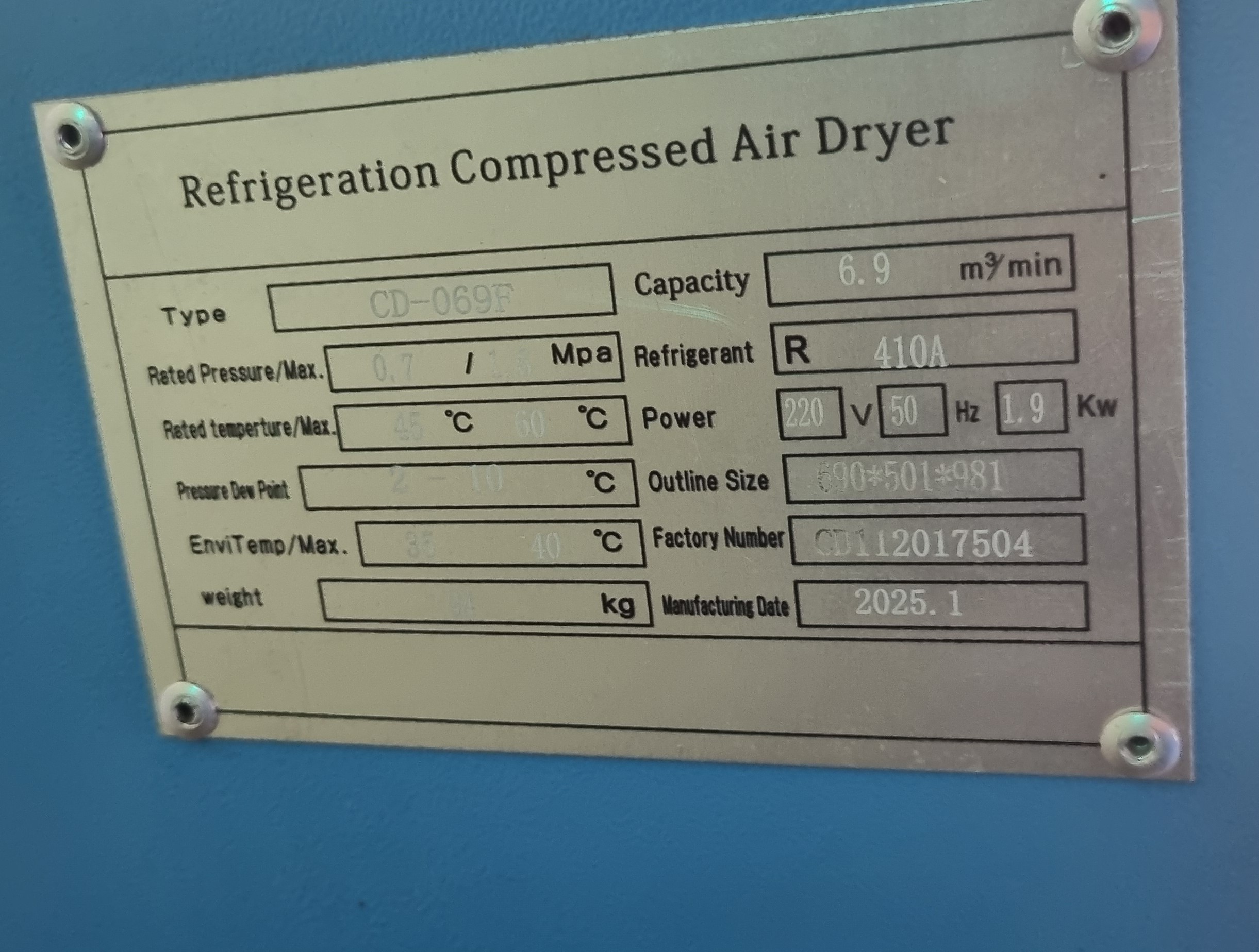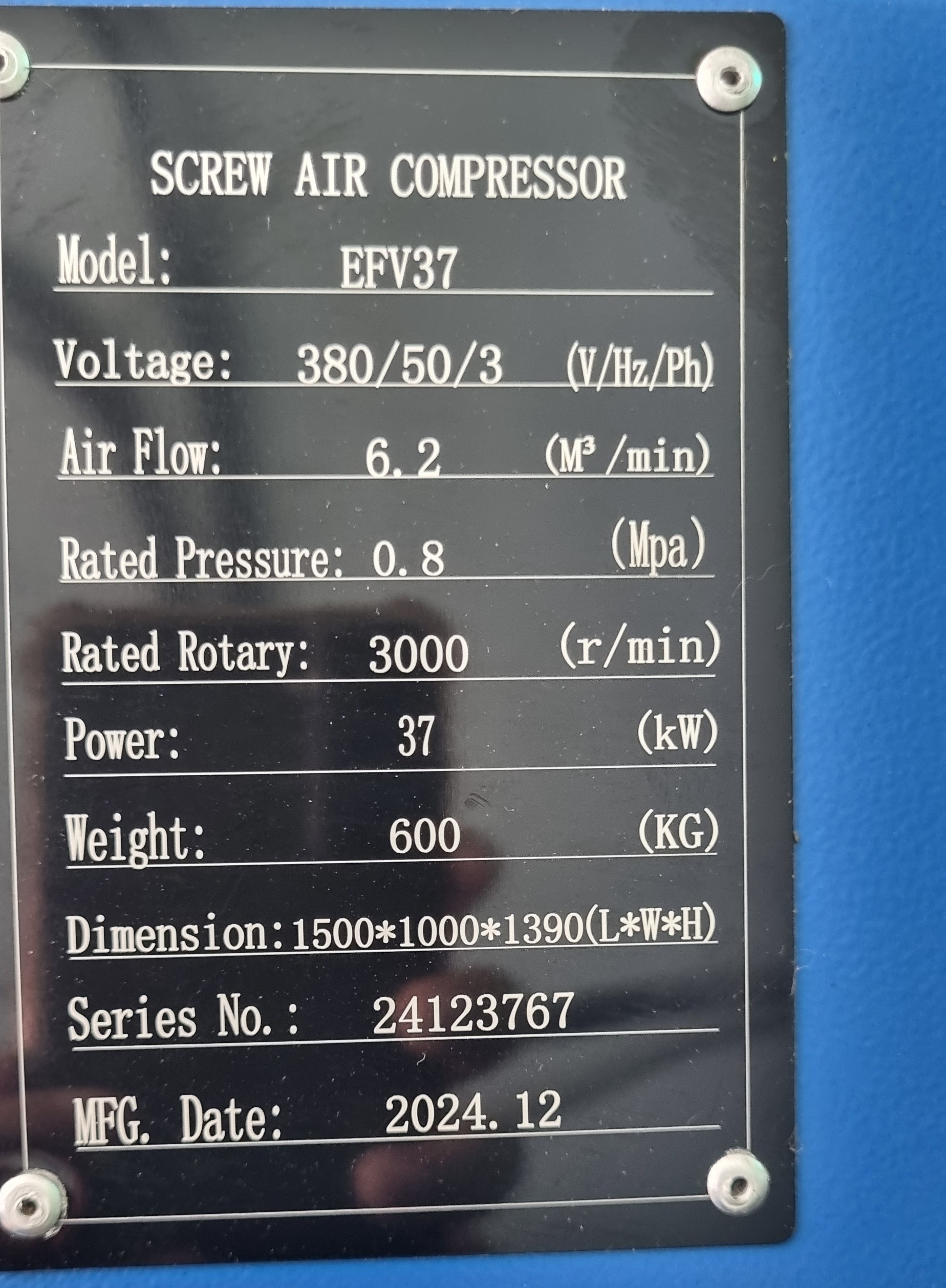 | Spesification | Voltage : 380 Volt/ 50 Hz, 3 Phase, Air Flow : 6,2 m³/min, Rated Volume : 0,8 Mpa, Rated Rotary : 3000 Rpm, Power : 37 kW, Air Dryer : CD-069 F, Capacity : 6,9 m³/min, Power : 1,28 kW, With Air Filter |