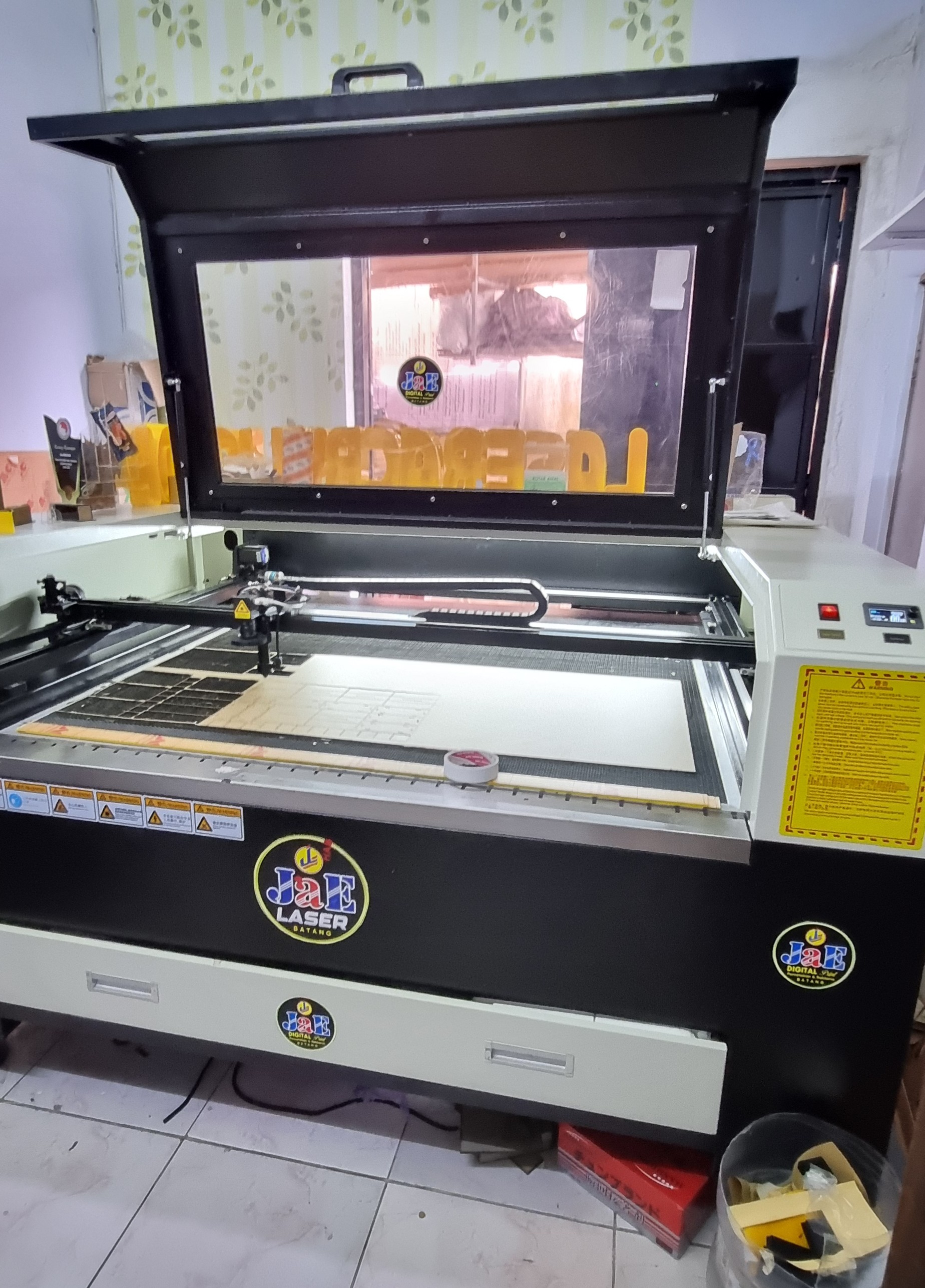 | Spesification | Laser Power 1200 watt, Working Area 1300*1000 mm, Operating Voltage 220 volt, Resolution Ratio 0,025 mm, Repotioning Accuracy 0,01 mm |
