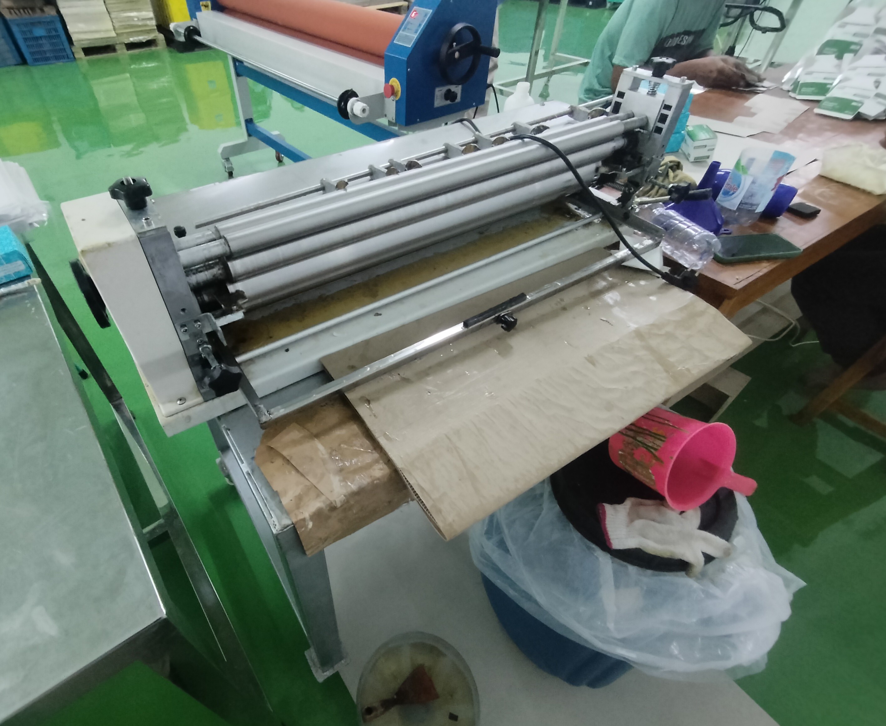 | Spesification | Max. Gluing Width : 720 mm, Min. Gluing Thickness : 0-300 g/m, Speed : 30 m/min, Power motor : 120 watt, Voltage 240 V, 50 Hz |