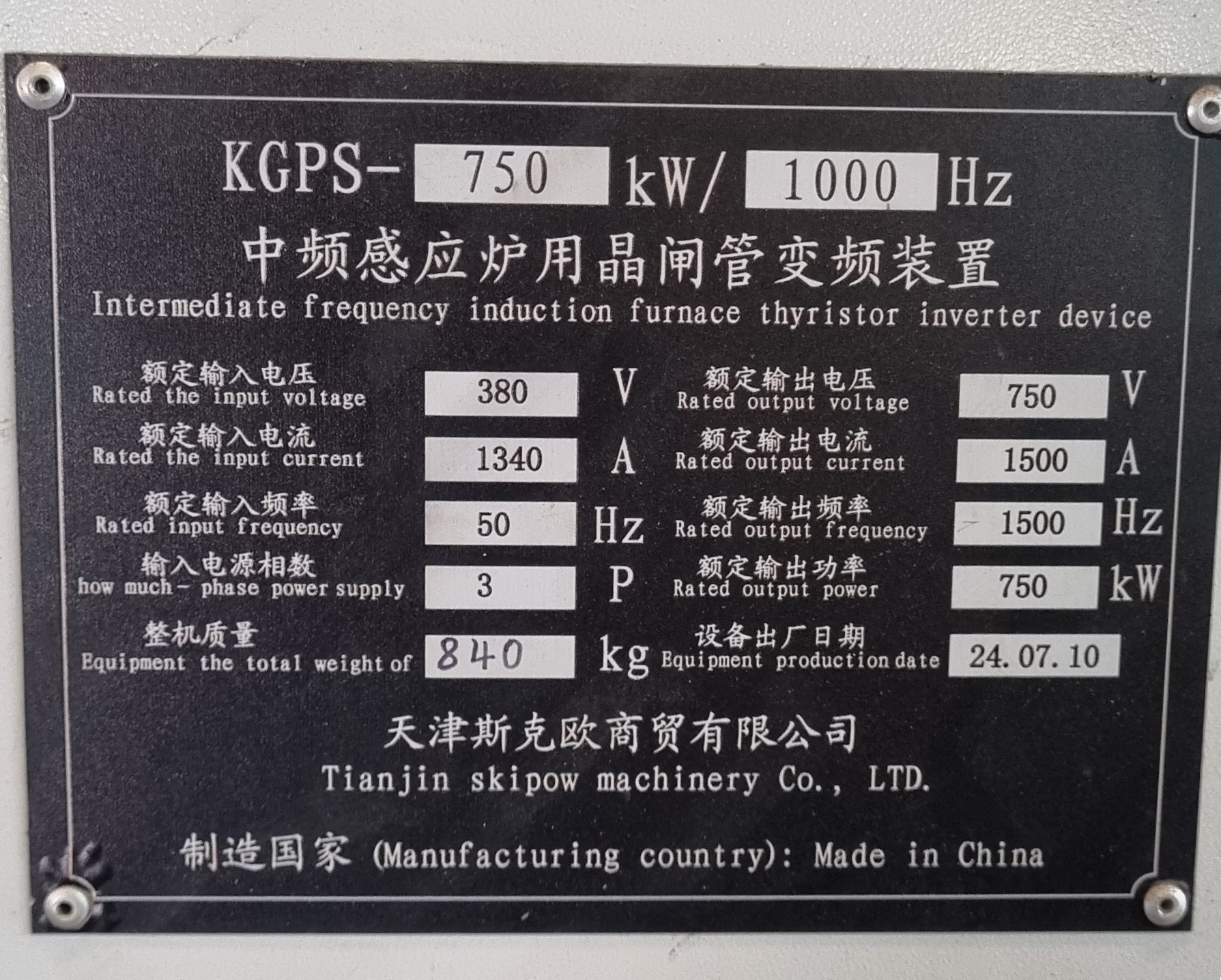 | Spesification | Rate Capacity : 1 T, Line Hickness : 100 mm, Temperature 1450˚C, Tilt Angle 95˚, Working Noise < 85 dBA, Melting Rate : 0,8 T/H, Power Consuption : 620 kW.H/T, Rated Power : 750 kW, Rated Frequency : 1000 Hz, Volateg : 3-380 olt/50 Hz |