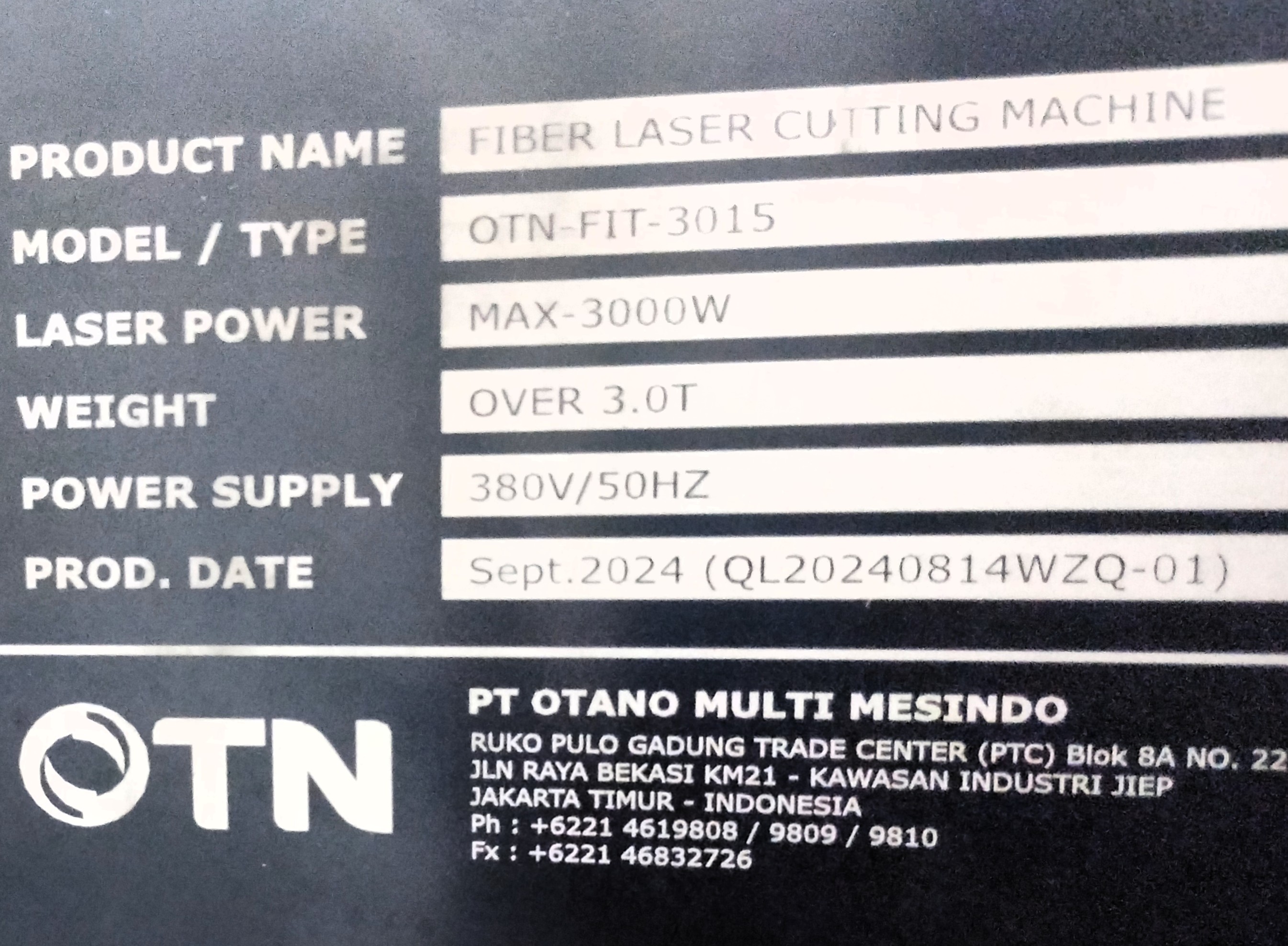 | Spesification | Working Area : 1500 x 3000 mm Power/Energi : 3 Kw Laser Wave Length : 1064 mikrometer Dimensi (PxLxT) : 4550 x 2280 x 2100 mm |