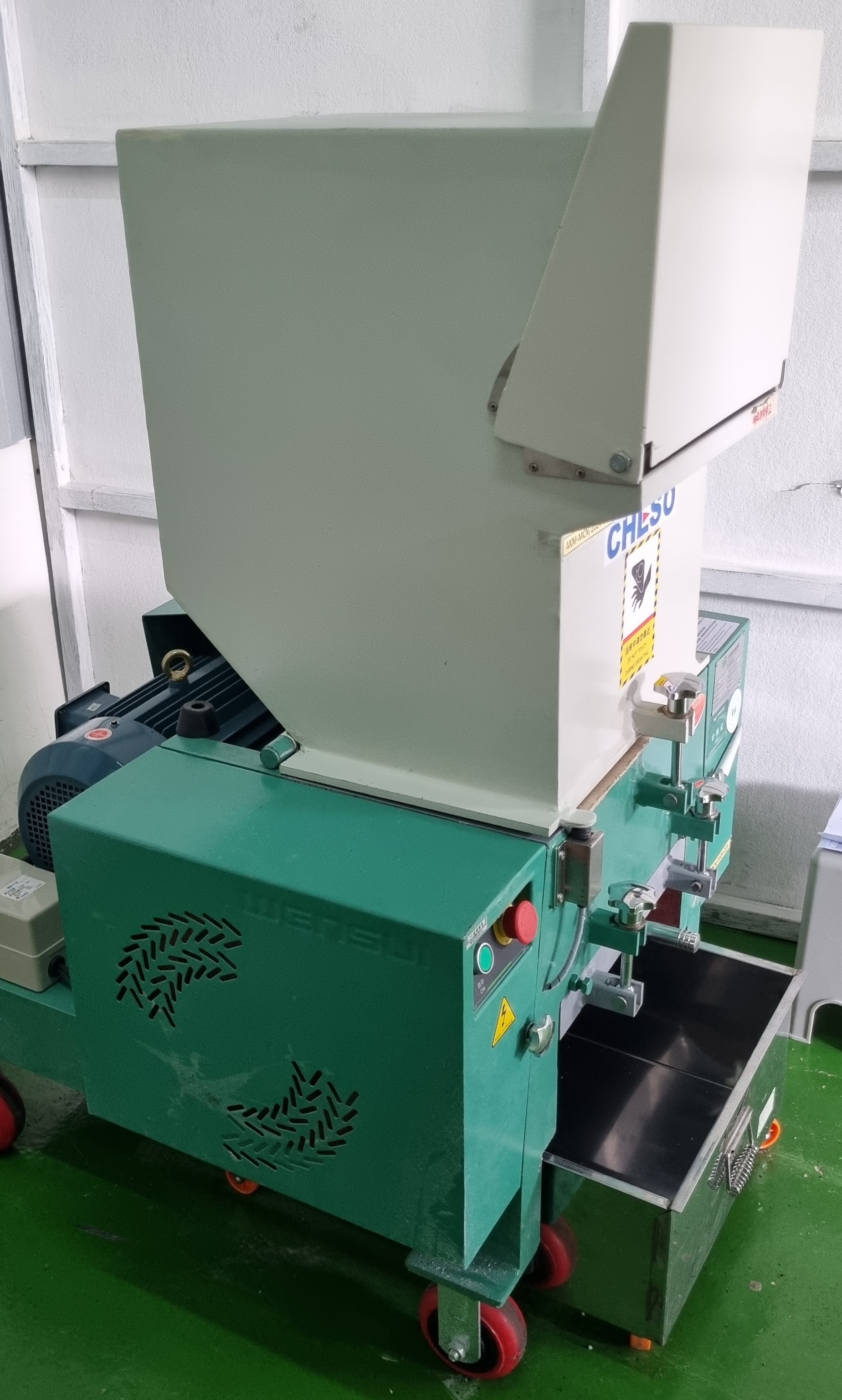 | Spesification | Crushing Chamber : 410×235mm, Throughput 200-250 kg/h, Fixed Blade : 2 pcs, Rotary Blade : 12 pcs, Power : 7,5 kW, Screen Opening : 8 mm |